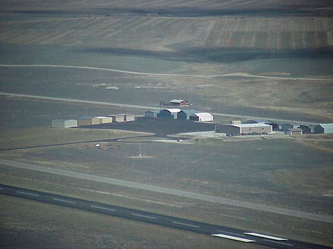 View looking northeast across runway at airport buildings. Highway 191 goes north off left side of picture behind airport buildings. |
