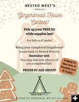 Nested West is offering free gingerbread house kits for kits. They have 150 kits available for kids under age 15. Maximum four kits per family. Bring completed gingerbread house back to Nested West by December 18th. Participants can also text photos of the co