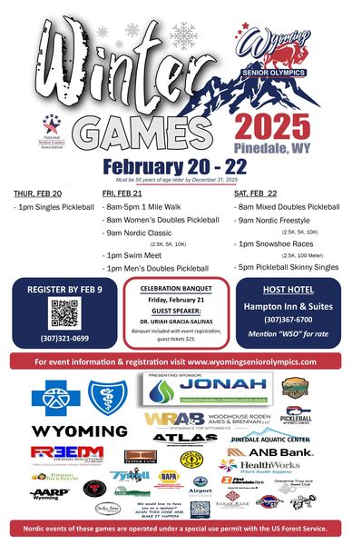The Wyoming Senior Olympics 2025 Winter Games will be held in Pinedale Thursday through Saturday, February 20-22. The games are for people 50 years of age or older by December 31, 2025. Games are sponsored by the National Senior Games Association. Register by February 9, 2025. For information and registration, visit www.wyomingseniorolympics.com. Schedule: Thursday, Feb. 20: 1:00PM: Singles Pickleball Friday, Feb. 21: 8:00AM-5PM: 1 Mile Walk 8:00AM: Women’s Doubles Pickleball 9:00AM: Nordic Classic (2.5K, 5k, 10K) 1:00PM: Swim Meet 1:00PM: Men’s Doubles Pickleball Celebration Banquet, guest speaker: Dr. Uriah Gracia-Salinas, banquet ticket included with registration Saturday, Feb. 22: 8:00AM: Mixed Doubles Pickleball 9:00AM: Nordic Freestyle (2.5K, 5K, 10K) 1:00PM: Snowshoe Races (2.5K, 100 Meter) 5:00PM: Pickleball Skinny Singles WY State Superintendent supports U.S. Department of Education’s Title IX announcement (posted 2/1/2025) Low cost insulin program available to Wyoming citizens (posted 1/30/2025) Rocky Mountain Power Foundation gives grants to support arts and cultural organizations (posted 1/30/2025) Big game applications open for Wyoming 2025-26 hunting season (posted 1/21/2025) |