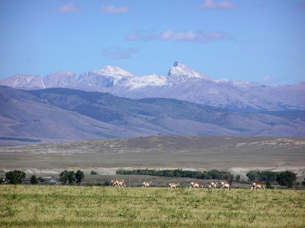 Pronghorn graze in a pasture along Paradise Road. Temple Peak is visible in the distance in the Wind River Mountains. |