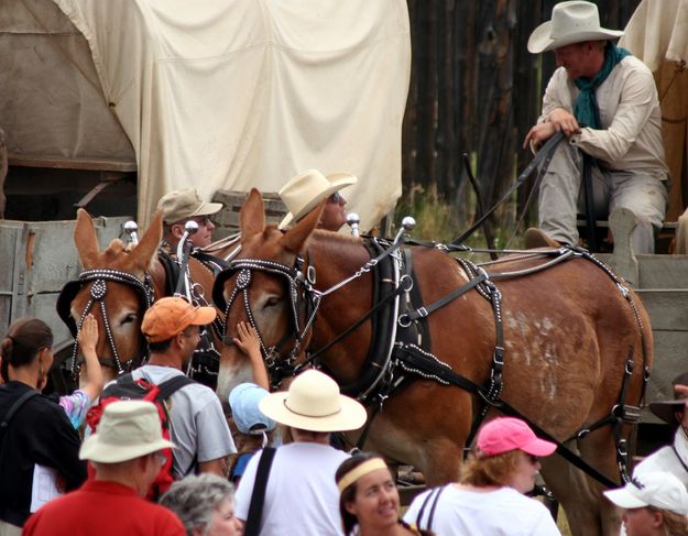 Spectators get a close look at work horses and get to talk with wagon driver James Rogers after the Rendezvous Pageant.