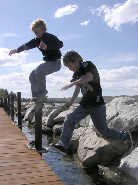 These boys enjoyed jumping from the breakwater rocks to the dock during the regatta. |