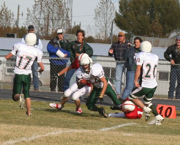 Dylan Nelson caught a 21-yd pass from Conor Raney to the Big Piney 7-yard line. Saving tackle by Gary Phillips (BP11). |