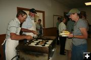 David Payne (left) and Mark Eatinger serve up pancakes during the Pinedale Community UCC Church Rendezvous Breakfast. They also had ham, eggs, juice, coffee and milk. The breakfast was by free-will donation.