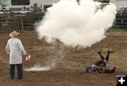 The rodeo clown drank the concoction in the jug and then keeled over backwards.