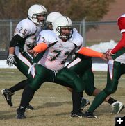 Austin Doyle (BP22) is surrounded Wranglers Jacob Brunette (P20) and Aaron Belton (P74) at the end of a 10-yard run.