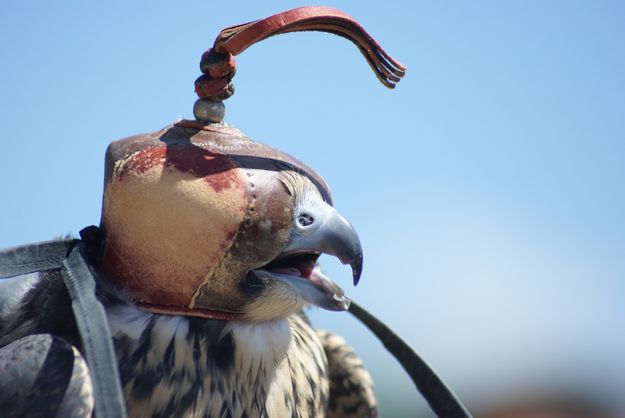 A young falcon sporting its falconry hood, handcrafted by Jones. |