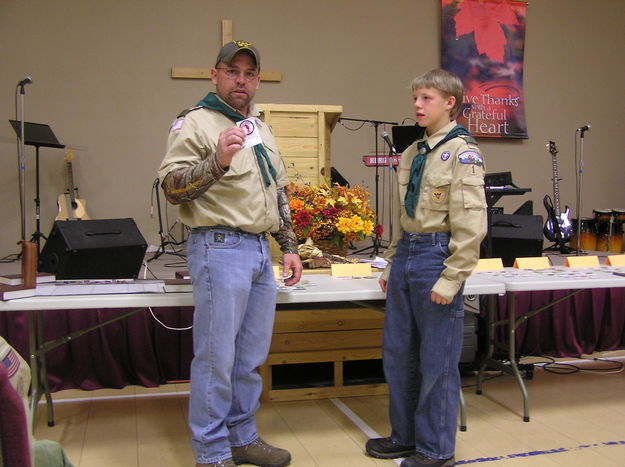 Scout David Rule (R) is given his new badge by Matt Piros (L). Photo courtesy Robert Lenz, Scoutmaster, Troop 1. |