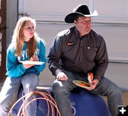 Justin Johnson enjoys his lunch with Shelby Eckley, one of the students at the Crossfire Arena's Johnson team roping clinc. Photo by Carie Whitman.