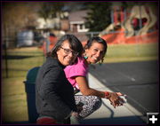 Josh Criddle and one of his three football playing sons had a pre-game huddle in the stands…and an energetic cheer team practiced building human pyramids and trustfully jumping into their team mate’s arms. The team buses from Wright arrived and eagerly waved out the windows. Team managers Audrey and Ginny posed for a photo and said they loved their job.