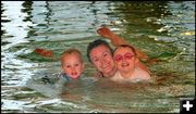 I got a couple foggy shots of folks warming up and having a nice time in the pool. Then I saw a girl with Big Hair and I asked Lily if I could take a photo, but she straightened me out on what it was. "It's called a messy bun," she said. "I just woke up and piled it on top of my head and came right here." She said Cork Kelly was her Grandpa, so he got in the shot, too.