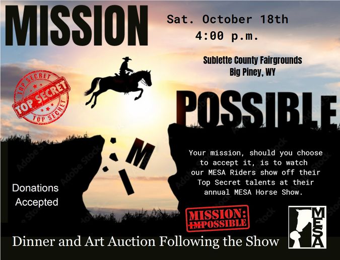MESA Therapeutic Horsemanship will be hosting their annual Horse Show on Saturday, October 18th at 4:00PM at the Sublette County Fairgrounds. This year’s theme is: Making Missions Possible. Everyone is invited. Dinner and Art Show afterwards. Donations appreciated. This year’s horse show theme is based on Mission Impossible. MESA riders show off their Top-Secret skills at the MESA Horse Show. It will be night filled with action, thrills, and food. We invite you to join our mission and show your support for the MESA riders. Come help MESA make missions possible…come see the show and become a sponsor! Related Links: www.mesarides.org