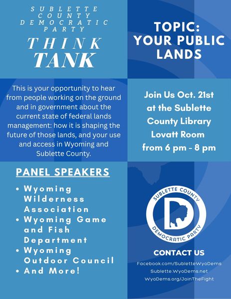 Sublette County Democratic Party will host a Think Tank on Tuesday, October 21st. The topic will be: Your Public Lands. This event will be at the Pinedale Library Lovatt Room from 6-8PM. Hear from people working on the ground and in government about the current state of federal land management, how it is shaping the future of those lands, and your use and access in Wyoming and Sublette County. Panel speakers: Wyoming Wilderness Association, Wyoming Game & Fish, Wyoming Outdoor Council, and more. For more info, see sublettewyodems.net or on Facebook: facebook.com/SubletteWyoDems The Gooch Family makes generous donation to the Museum of the Mountain Man (posted 10/12/2025)