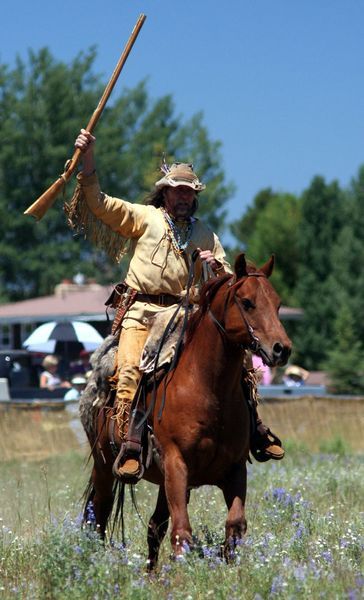 Rendezvous is four days of fun, play, entertainment, history, rodeoing and partying in Pinedale. There is always something going on, and lots to see and do! Here, Dave Vlcek plays the part of Joe Meeks during the Rendezvous Pageant (Sunday at 1:00PM). Pinedale Online file photo. |
