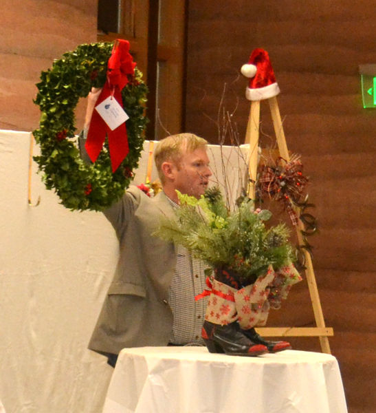 Travis Bing holds up a wreath. Travis is a board member of the Sublette County Historical Society. Photo by Joy Ufford, Sublette Examiner. |