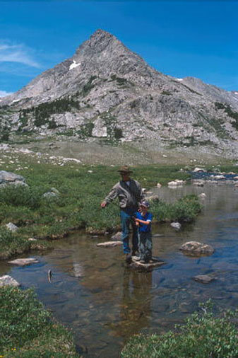 Trip Timico Lake, Wind River Range Andy Pearson and his dad Mark fish the outlet of Timico Lake. Mark and his wife Kelley run an outfitting business, O'Kelley Outfitters, from their home near Pinedale. They specialize in drop packs and resupplies. |